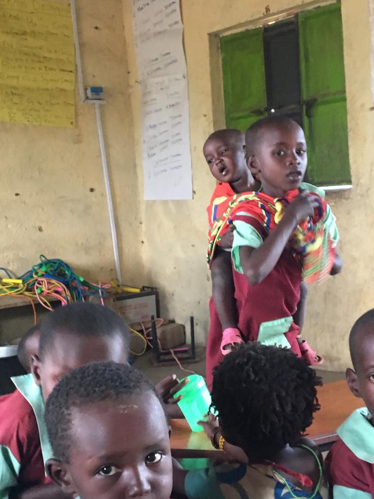 A boy taking care of his younger brother while in school